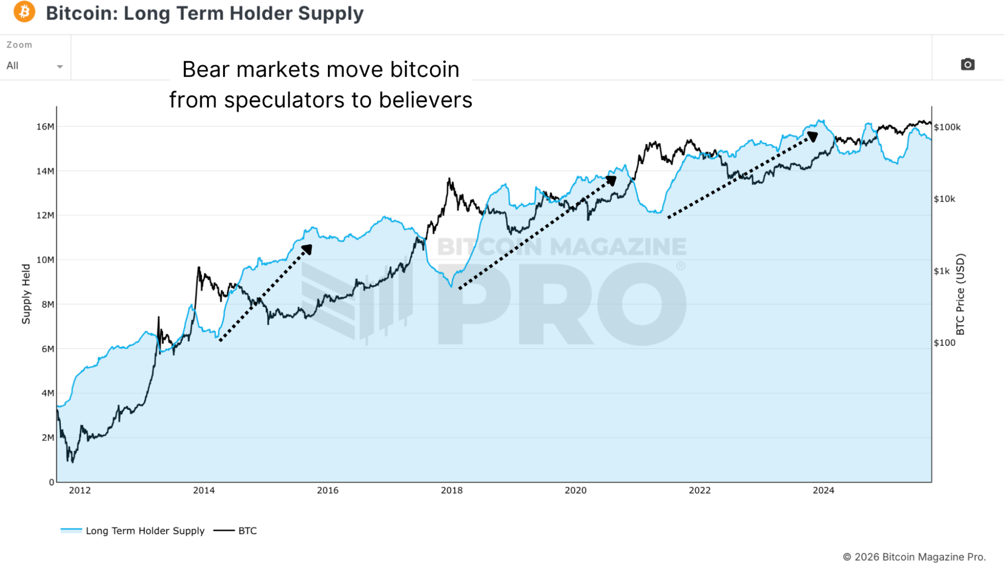 Bull markets bring interest and excitement, and new money. They expand the base. But bear markets do something perhaps more important. Bear markets shift coins from those with low conviction to those with high conviction. People who bought Bitcoin as a get-rich-quick scheme simply give up. But people who believe in Bitcoin’s long-term vision hold or even accumulate further. Every bear market has strengthened Bitcoin’s conviction base. Every cycle has moved Bitcoin from speculators to believers.