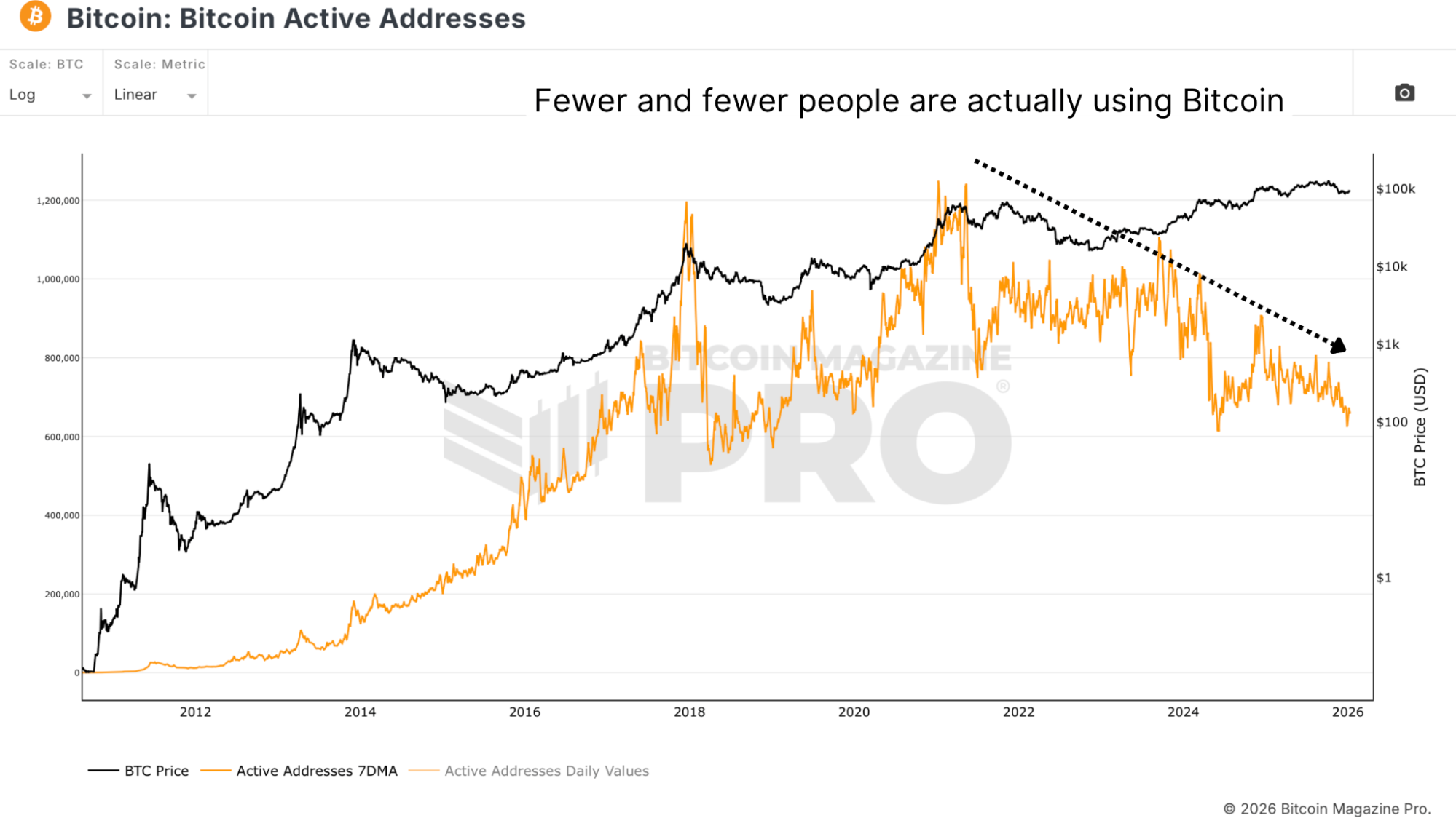 Figure 3: The decline in Bitcoin Active Addresses.