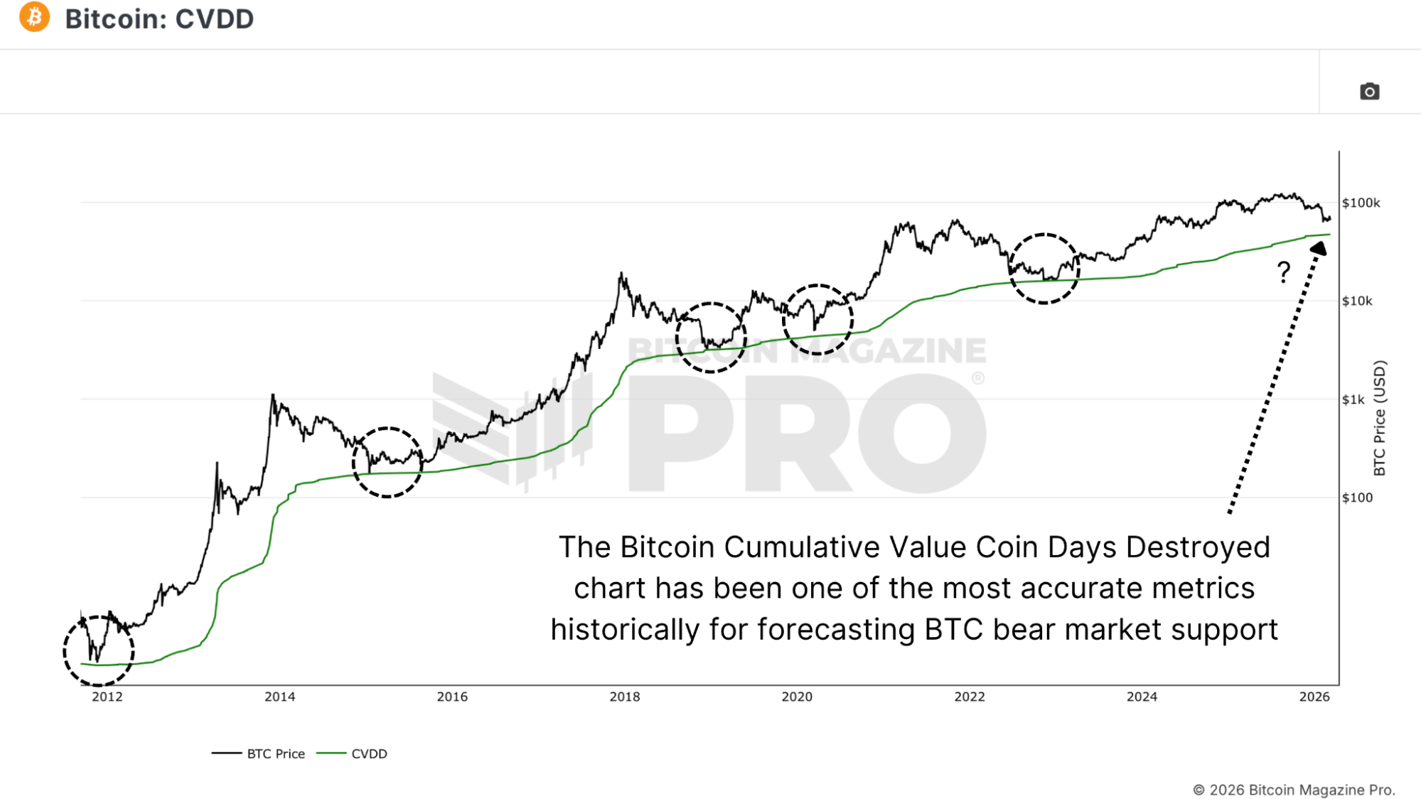 The first place to start is the Cumulative Value Coin Days Destroyed (CVDD), one of the more advanced on-chain valuation models available on Bitcoin Magazine Pro, and in my view, the most historically accurate tool we have for estimating where Bitcoin is likely to find a bottom during bear cycles. The CVDD essentially measures the cumulative economic weight of Bitcoin being moved on-chain, specifically coins that have been dormant for extended periods. When long-held coins finally move, it carries significant informational value about where value is being transferred and at what price.