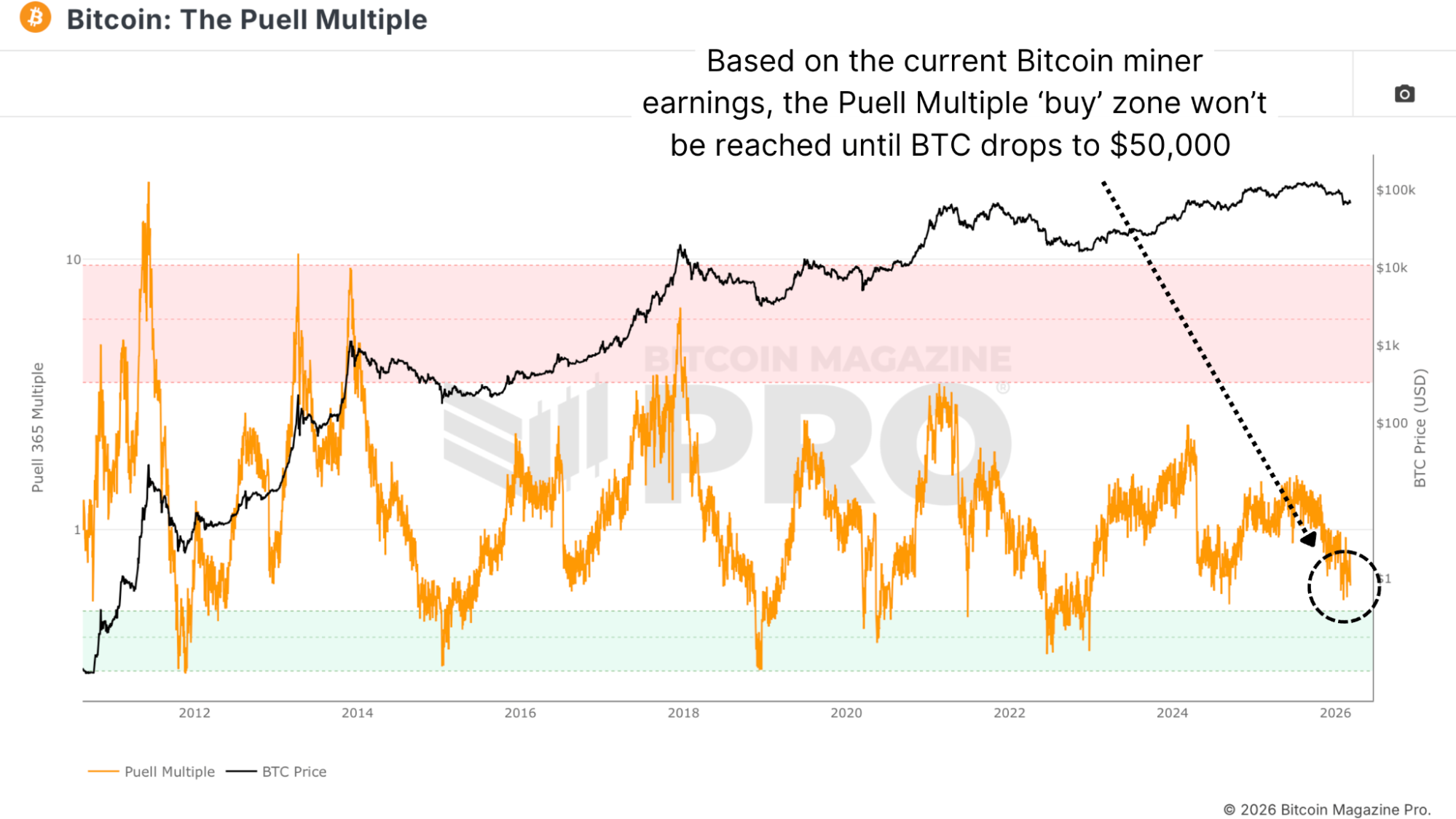 Currently, the 365-day moving average of miner earnings is around $45 million per day. The accumulation threshold at a Puell Multiple of 0.5 puts that trigger at roughly $22.5 million per day. When you work backwards from that figure, dividing by the average daily block production of 144 blocks and then by the current block reward of 3.125 BTC, you arrive at a Bitcoin price of approximately $50,000.