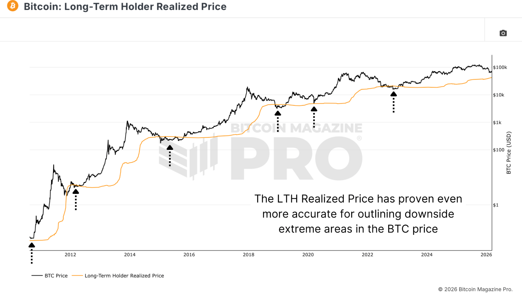 Historically, this metric has been even more accurate than the standard realized price as a bear market floor indicator. In the 2020 COVID crash, Bitcoin bounced almost exactly from the LTH Realized Price. In the 2022 bear market (excluding the FTX shock, which caused an exceptional brief undershoot), it again marked the approximate bottom.