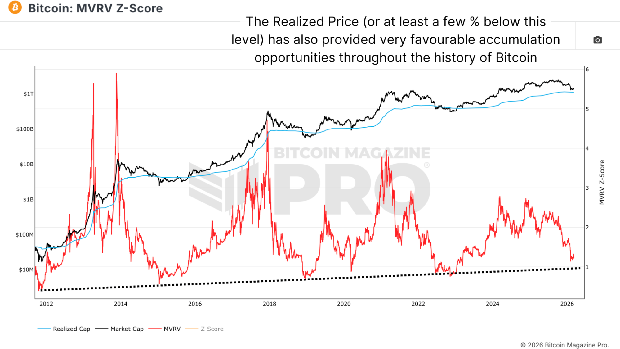 The next metric to look at is the Bitcoin Realized Price, arguably the most widely used and important on-chain metric in the space. The Bitcoin Realized Price is the average cost basis of every single Bitcoin in circulation. When Bitcoin's market price dips below the realized price, it means the average investor is sitting at a loss. Historically, these periods have represented genuine capitulation events and some of the best accumulation windows in Bitcoin's history. Currently, the realized price is sitting in the mid-$50,000s and trending downward.