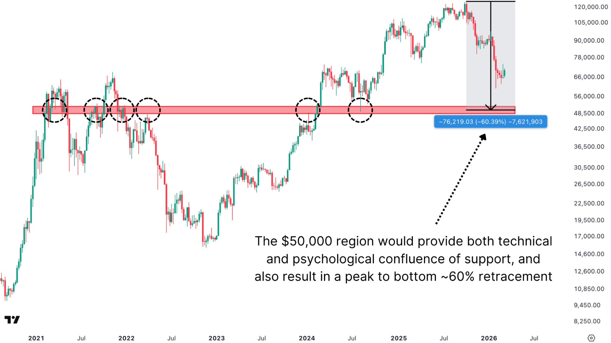 On-chain and fundamental data aside, $50,000 is also one of the most significant technical levels in Bitcoin's history from a pure price action perspective. Going back through Bitcoin's past near decade of trading, $50,000 has served as resistance on multiple occasions, then converted to major support, and has consistently been a price point that the market treats as psychologically and technically significant. A move from Bitcoin's recent all-time high to the $50,000 zone would also represent approximately a 60% peak-to-trough retracement.
