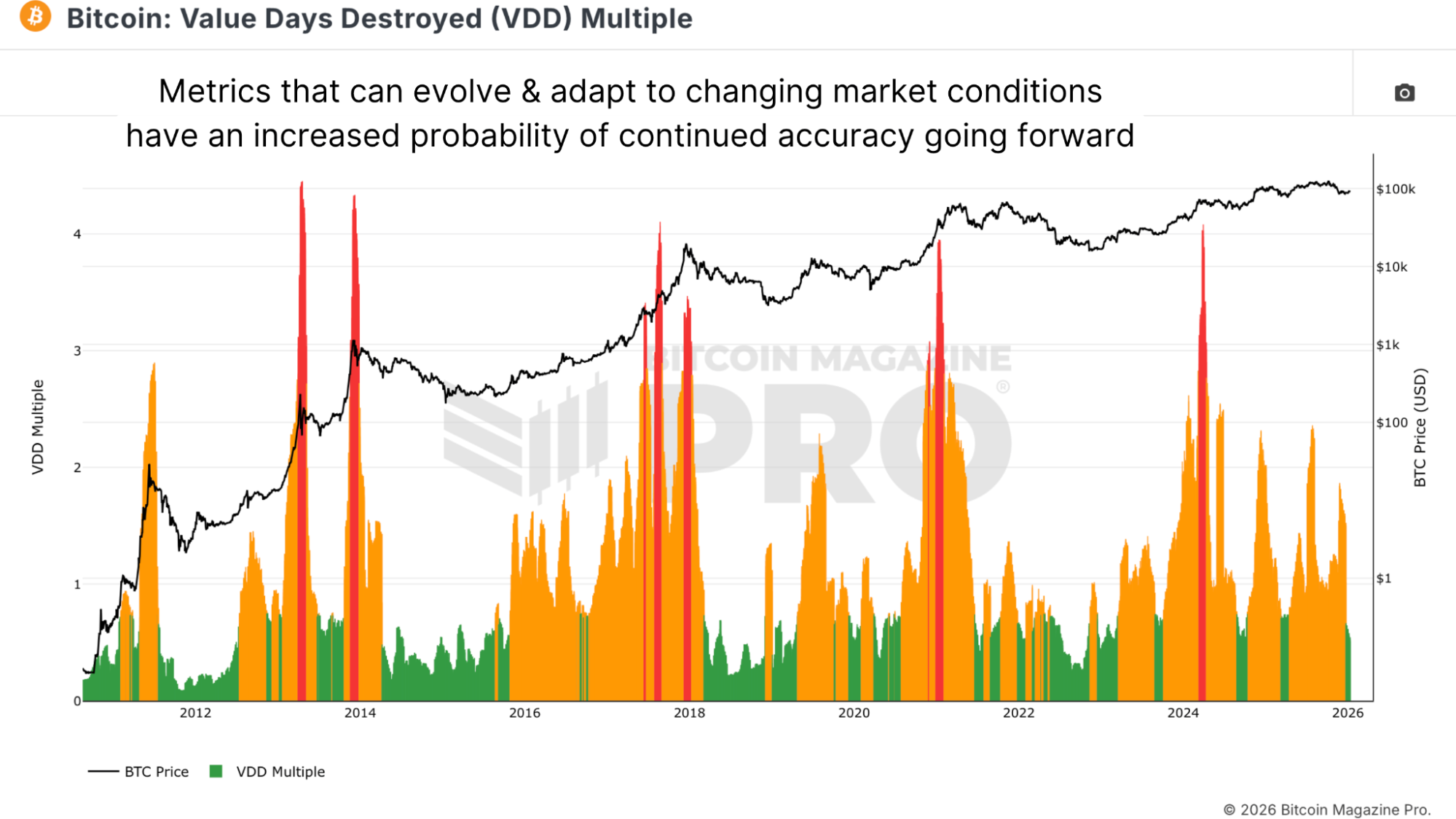 The Value Days Destroyed (VDD) Multiple measures USD-denominated profit-taking rather than just volume of coins moved. It calculates the 30-day average value days destroyed (number of coins moved multiplied by number of days since coins last moved multiplied by $BTC price) divided by the 365-day average. Spikes to red regions indicate market cycle peaks as distribution reaches historically elevated levels. This metric captures the severity of profit-taking in USD terms rather than pure Bitcoin volume.