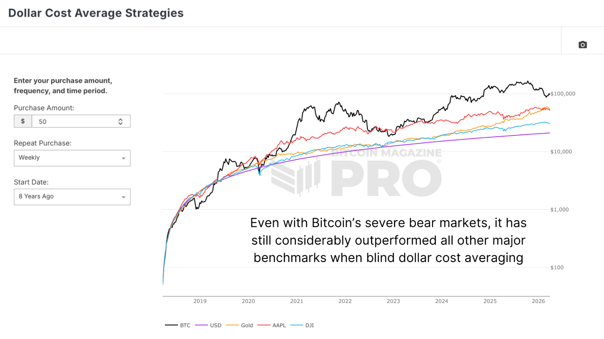 Cast your mind back eight years. Bitcoin was around $9,000 and around a 50% retracement from the peak, maybe not too dissimilar to where we are now. If you had simply started dollar-cost averaging from that point, buying consistently through every swing, every panic, every "this time it's different" headline, the outcome would have been extraordinary. Massively outperforming equities and even gold over a period when gold itself went exponential. The ups and downs, the turbulence and the chop, none of it changed the outcome meaningfully, because the strategy never required you to be right on any single day.