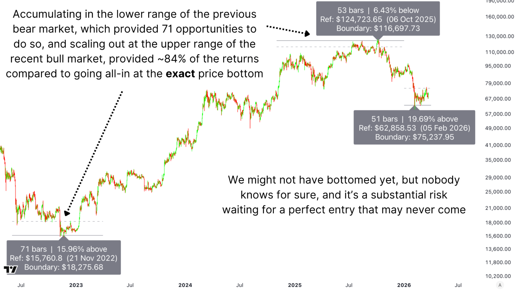 The data across every Bitcoin cycle points to the same conclusion. The bottoming window is wide, accessible, and far more forgiving than the topping window. Dollar-cost averaging through a recognised accumulation zone, informed by on-chain data, historical ATR ranges, and cycle positioning, isn't settling for second best. It's the rational, evidence-based approach that has outperformed almost every other strategy across Bitcoin's entire history.