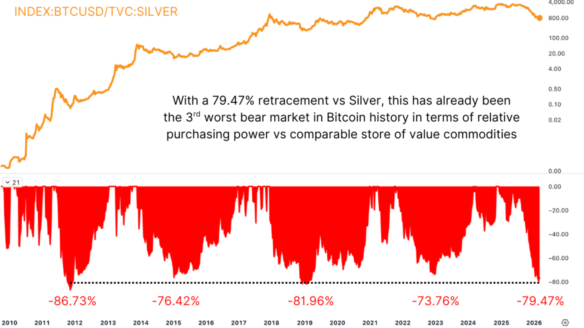 Figure 3: Measured in terms of silver, Bitcoin’s current retracement ranks amongst the worst.